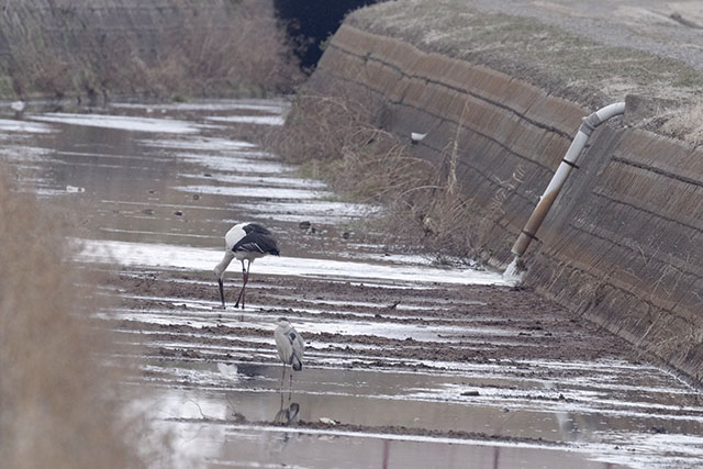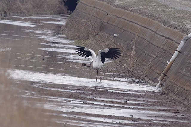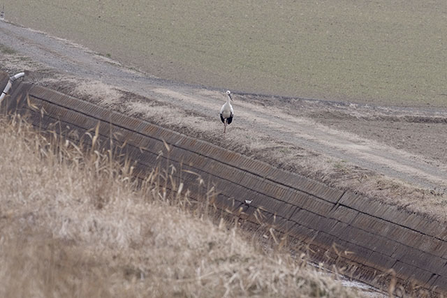 チョウゲンボウ君に気をとられていたら、コウノトリ君が飛び立ってこちらの土手の上を越えて反対側の田んぼの縁の用水路に降り立った.間近に見るとやはりデカイ.丹頂鶴くらいはありそうだ.