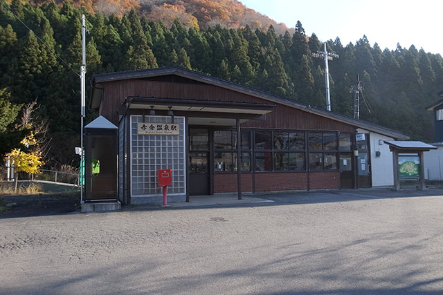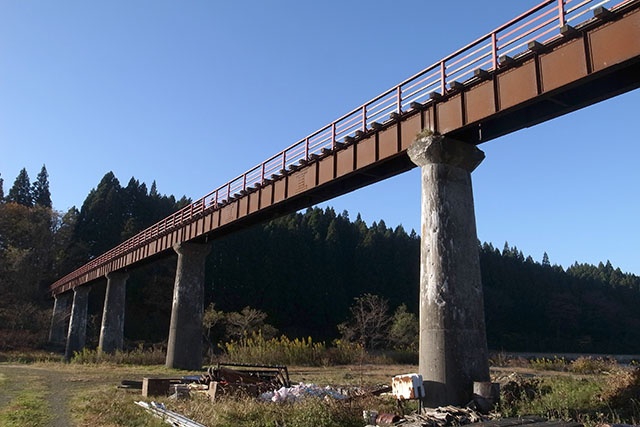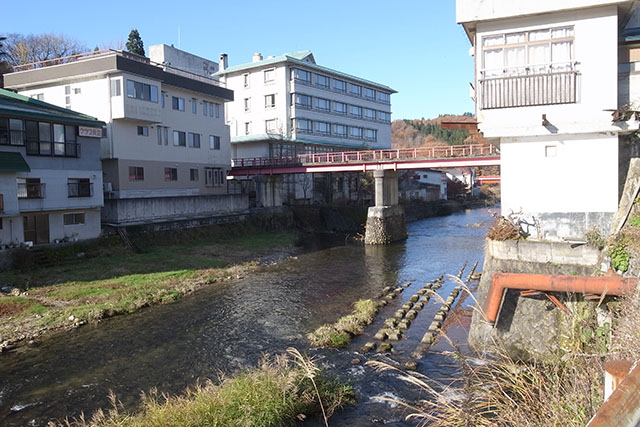 昨日は国道47号線から赤倉温泉へ向かう分岐地点まで歩いたので、この日は赤倉温泉駅から歩き始めることにした.地理院地図では駅前から国道を通らずに赤倉温泉方面へショートカットできそうな道が描かれていたのでそちらへ向かってみた.川を渡る赤い小さな人道橋が見えたので期待して行ってみたら、入り口が通行禁止の看板とともに塞がれていて渡ることができない状態だった.仕方が無いので川沿いに国道方面の自動車道まで迂回することにした.
