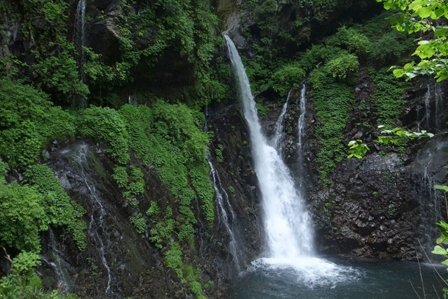 二十余丁、山を登って滝有.岩洞の頂より飛流して百尺千岩の碧潭に落たり.岩窟に身をひそめ入て、瀧の裏よりみれば、うらみの瀧と申伝え侍る也.