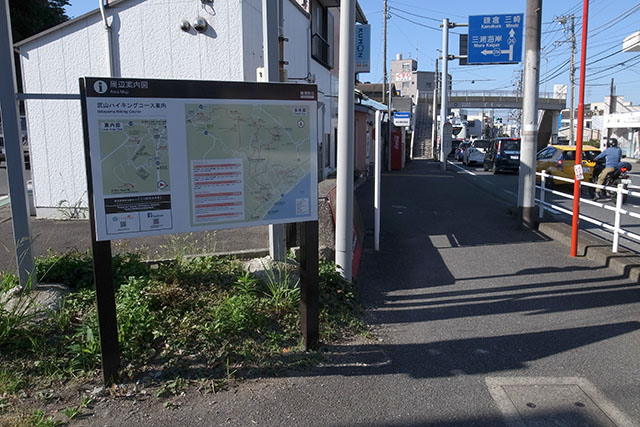 京急横須賀中央駅から市民病院行きのバスに乗り、35分ほどで武山ハイキングコースの入り口がある一騎塚停留所で下車する.住宅地の中の舗装された曲がりくねった道をトコトコ登って行く.要所要所にハイキングコースの案内標識があるので、地図を見なくても武山まで登って行くことができる.