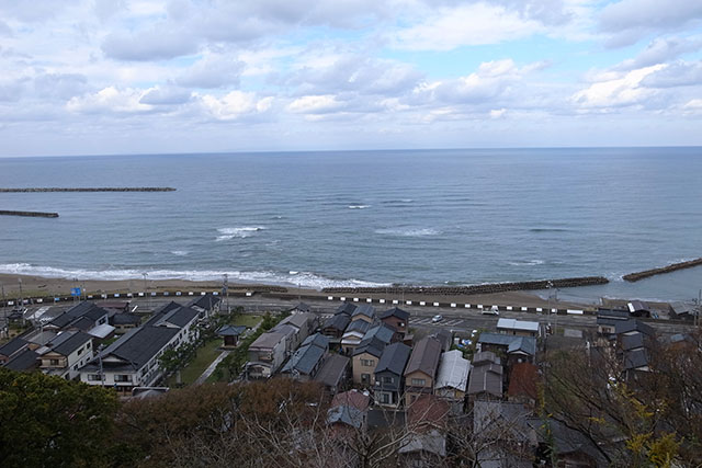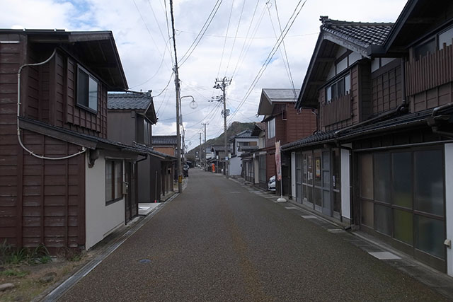 良寛記念館の隣の公園から旧街道を一望することができるが、海岸線沿いの非常に狭い場所に街道が設けられており、街道の両端にそれぞれ一軒分のスペースしかない非常に狭い町並みが続いている.