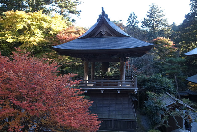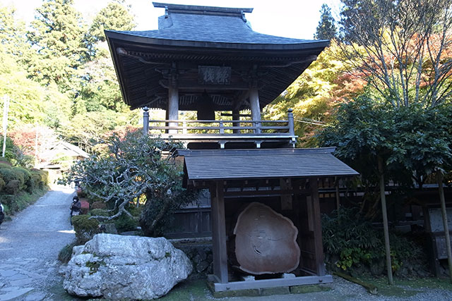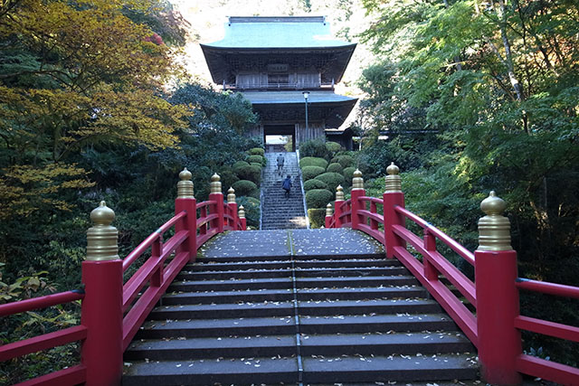 清流に掛かる真っ赤な欄干の太鼓橋の先に石の急な階段が続き、その先に古びた巨大な山門が聳え立っている.山間部の狭い境内の割に巨大な山門の偉容に圧倒される.
