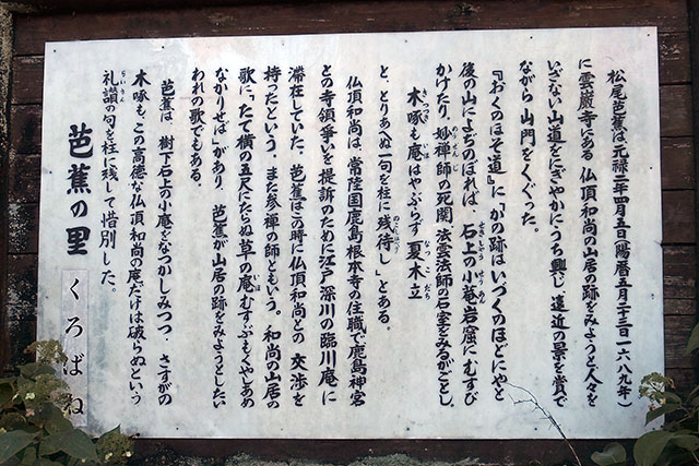 奥の細道の旅では、芭蕉と曽良は日光を参詣した後に黒羽へ向かい、四月三日から十六日までの二週間にわたる長い期間にわたり黒羽に滞在している.この間、家老の浄法寺図書(俳号桃雪)と弟(俳号翠桃)らと歌仙を巻いたり近隣のお寺や那須の与一ゆかりの神社などを観光している.