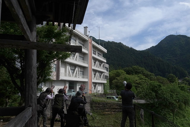この週末も天候に恵まれ、天龍村役場の隣にある自慶院というお寺の境内の観察スポットには、大勢のカメラマンたちが集まっており、お寺が用意してくれているCATVのモニター画面の様子を見ながら、親鳥が巣箱から出てくるのを辛抱強く待っていた.