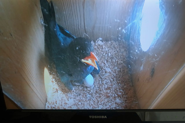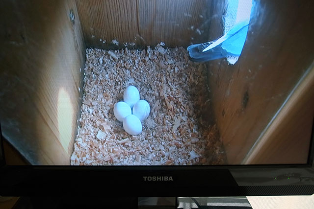 6月の今頃は丁度雛が孵化して、親鳥が沢山の昆虫を捕まえて雛たちに給餌をする季節で、親鳥の行動を観察するには絶好の時期だ.天龍村役場の屋上に設置された巣箱では、今年は4個の卵が産み付けられており親鳥が抱卵しているが、孵化の目安となる3週間以上が経過しているが、今日(6/25)時点ではまだ1羽も孵化していないようだ.
