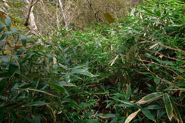 今回は時間が無かったので、駒ヶ岳には立ち寄らずに芦ノ湖の湖畔の桃源台と神山との間のピストンとなってしまった.以前の山と高原地図では芦ノ湖の湖畔から神山への登山口まで破線ではあるが、県道を歩かなくてすむ破線の登山道が記されていたので、帰路この道を使って下山可能かどうか試しに分け入ってみたが、背丈を遙かに超えた超弩級の笹藪に阻まれて全く先に進めなくなってしまった.この登山道は現在は完全に廃道状態で、歩くことは不可能な状態だった.